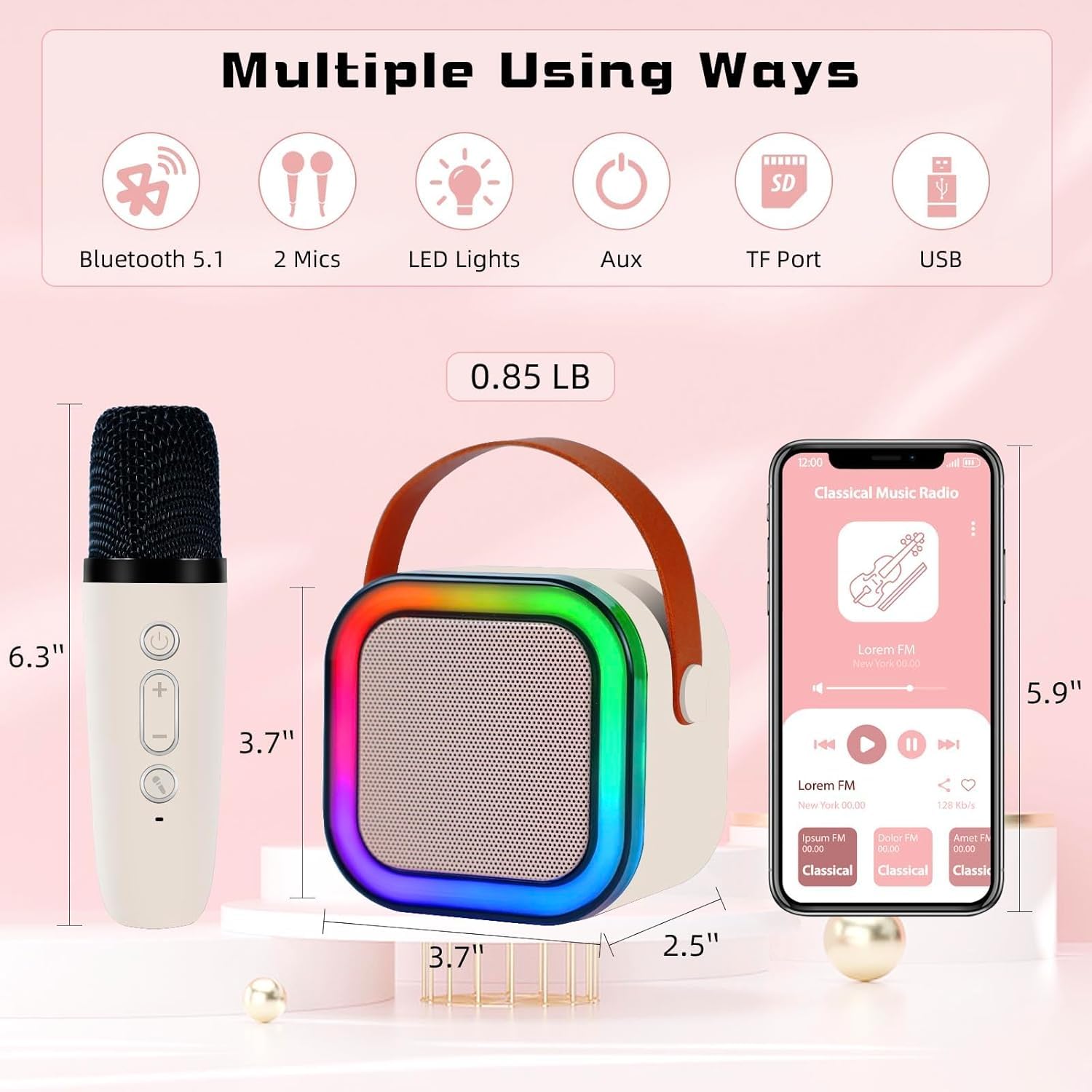 The karaoke machine and microphone set can be easily connected via Bluetooth and supports a TF card(not included). It can also be used as a speaker, player with dancing lights.