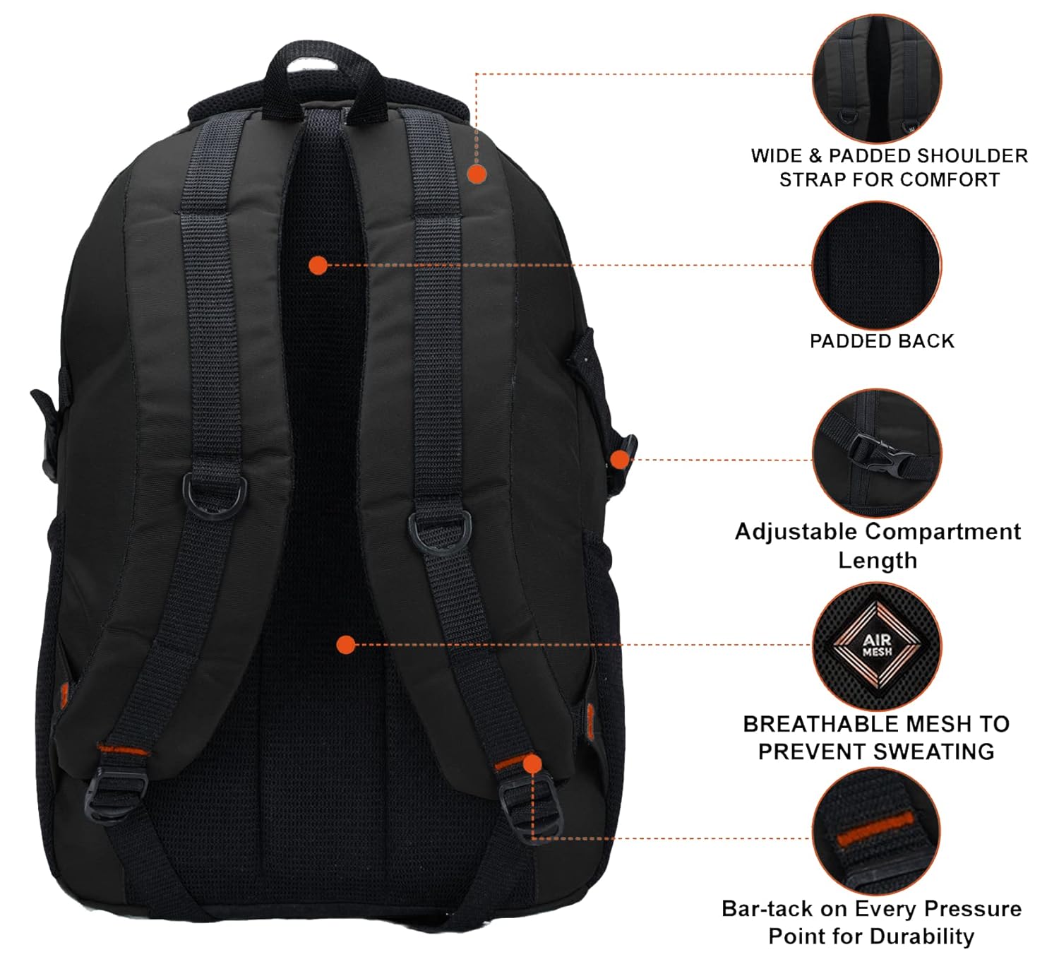 Other Features: Rain Cover, 17 inch Laptop compartment, Internal Organiser(Small Pockets), Strong and durable zippers, Adjustable Shoulder Handles (Straps) , 2 Bottle/Umbrella holders , Padded Handle , Padded Laptop Compartment , Ergonomic Design, Reflector Logo, etc