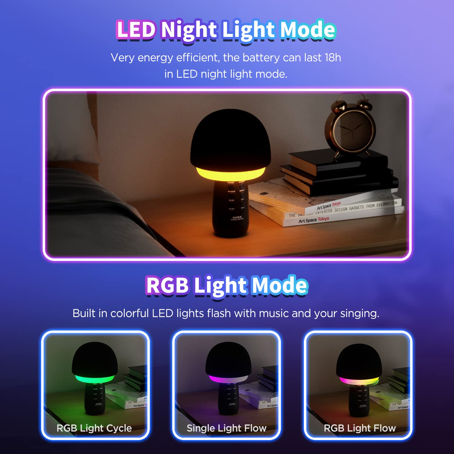 2. Intelligent noise reduction, creating a stunning KTV live-sound environment and wonderful echo reverberation. It’s a magic microphone for voice-changing. There are five sound modes: original sound, children’s voice, female voice, and male voice. It can be more fun.