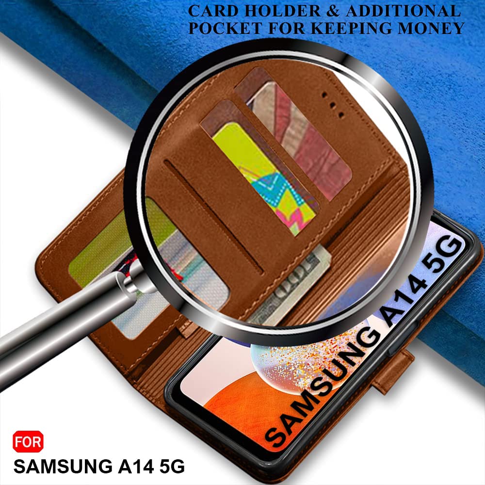 TheGiftKart Flip Cover Back Case for Samsung Galaxy A14 4G / A14 5G | Genuine Leather Finish | Designer Button | Inbuilt Pockets & Stand (Brown)